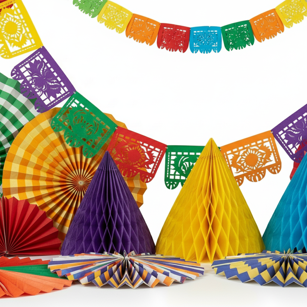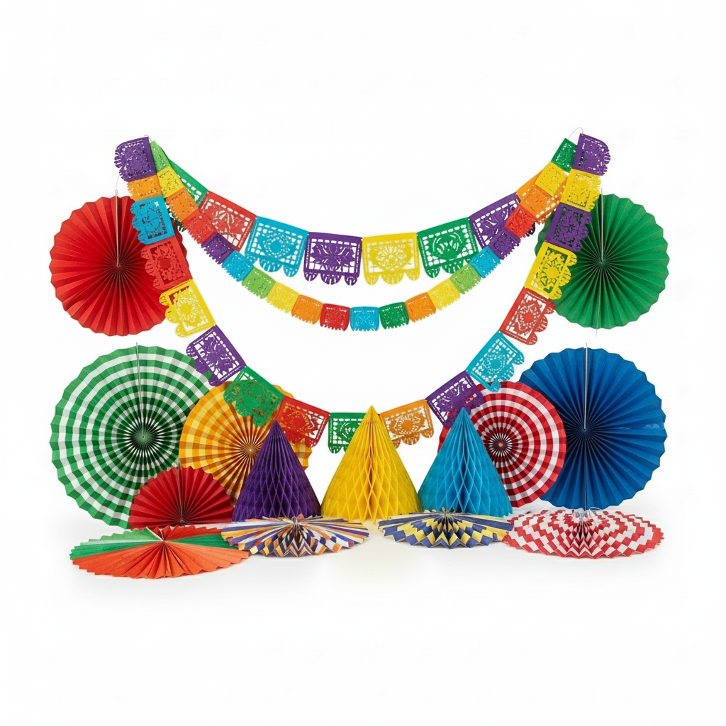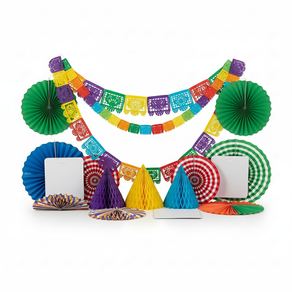 This multi-piece kit includes paper fans in various sizes (8 to 16 inches), honeycomb balls, and a matching paper garland to create a full, layered look.
